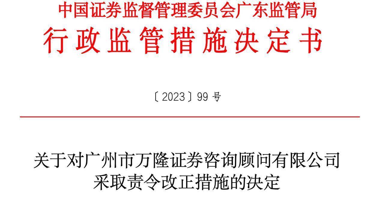 12月9日,中国证监会广东监管局对广州市万隆证券咨询顾问有限公司(简称“万隆证券”)采取责令改正监管措施。
